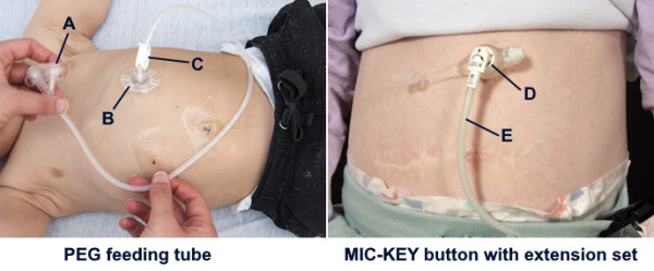 A gastrostomy PEG feeding tube and a MIC-KEY button used in a child. A, feeding port. B, flange (bumper). C, clamp. D, MIC-KEY button. E, extension set.